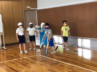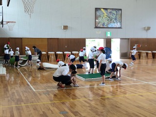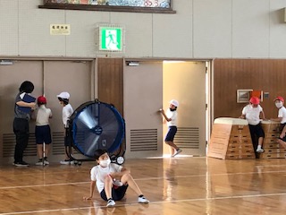 1クラスは体育館でマット…をちょうど力を合わせて片付けているところです。終わった人は扉を閉めたり、大型扇風機の風に吹かれたり。スポットクーラーで涼んでいる人たちに、スポットクーラーが役に立っているところをHPにあげたいけど…と声をかけると気持ちよくOKがありました♪