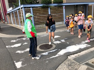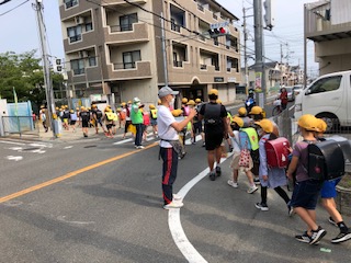 運動場へ出ると、さーっと風が吹き、涼しく感じる朝でした。羊がたくさん並んで雲になって広がっているような空がおもしろいな〜、と思いながら門へ向かいました。どの班の子どもたちも、穏やかに1列で登校して来ました。