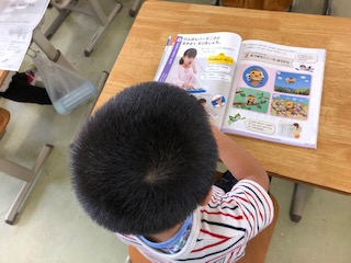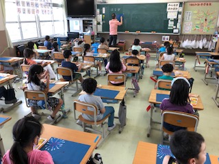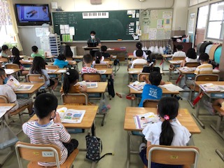 1年生の2クラスです。1クラスは音楽、♪ぶんぶんぶん ハチが飛ぶ♪の曲をいろいろ変えて、情景を見ながら鑑賞です。明るく軽やかな時、不安気でくらい音調の時、同じ曲なのに全然違って聞こえ、みんな引き込まれて聞きました。