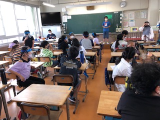 6年生の教室です。1クラスは学級会を全て自分たちで進めます。周りとも話し合って、意見を出しています。とても自立した学級会です。