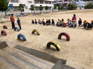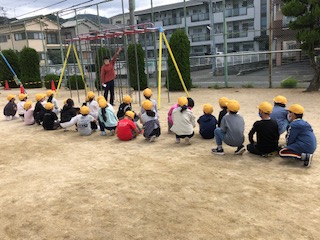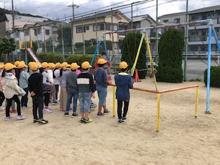 2年生の1クラスが2列で出て来ました。今日から遊具で遊んで良いために、一つ一つの遊具の前で、使い方、やっちゃいけない遊びや危険なことの注意をし、質問を受け付けます。ブランコは老朽化しているので危険がないかを確認してからの許可になります。子どもたちは注意深く聞いていました♪♪