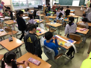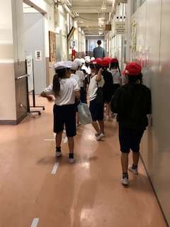 1年生の2クラスです。1クラスは図工でちょうど他の2クラスの廊下に飾られている図工の作品を製作中です。1クラスは体育でした。2列で静かに移動して行きました♪