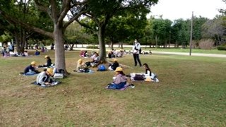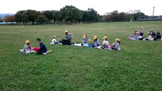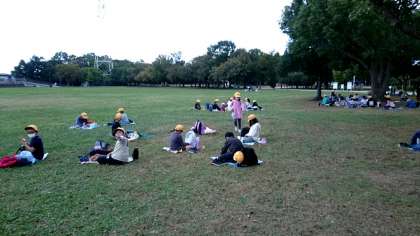 2年生と4年生、今日は遊ぶのも一緒、お弁当も一緒です。距離を空けて、一方向を向いて、…屋外、というだけで何か安心感があります。お家から待たせてもらったお弁当、何が入っているかな〜?♪