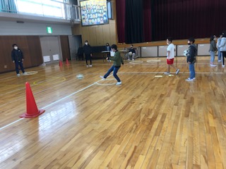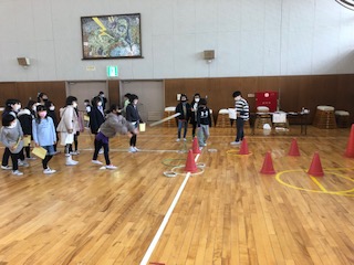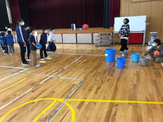 仲良し学年の仲良し交流で、5年の1クラスと3年の1クラスが体育館で活動しています。輪投げ、サッカーゴールシュート、ボールのバケツ投げ入れの様子が見えます。3年生は楽しそうにやっています。5年生は、スムーズにできて3年生が楽しいようにと、いろいろな心配りをして準備に余念がありません。頼りになるお姉さん、お兄さんです♪