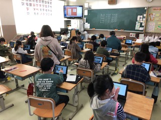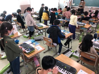 1年生の2クラスです。1クラスはタブレットで「キーボー島」をしています。ローマ字入力が身につくドリルで、1年生から楽しく取り組むことができます♪1クラスはミニオルガンで曲を弾いています。他の楽器の音を選ぶことができることがわかり、試しています♪