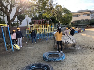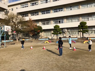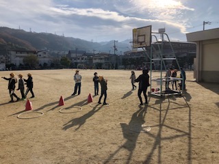 3年生と5年生の仲良し交流会、最後のクラスです。柔らかな陽射しに包まれて、運動場のあちらこちらにコーナーを設けています。バスケゴールへのシュートは、普通のシュートにジグザグにドリブルしてからのシュートと2種、ジャングルジムにぶら下げた的当てもあります♪