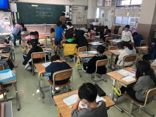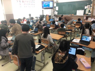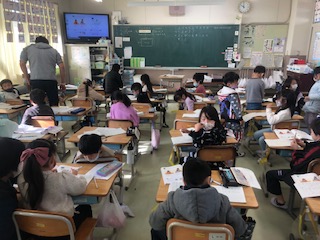 1年生、1クラスはお手紙を書く学習です。「お母さんへ」の文字が見えました。受け取って笑顔になるお母さんが思い浮かびます♪ 1クラスは算数で「長さくらべ」。物を使って2つの長さを比べます。自分の鉛筆や消しゴムを使って何回分かを測っているようです♪ 1クラスはタブレットでキーボー島アドベンチャーに挑戦、クリアするとWINの文字が出ます♪