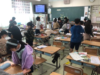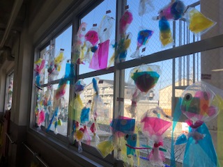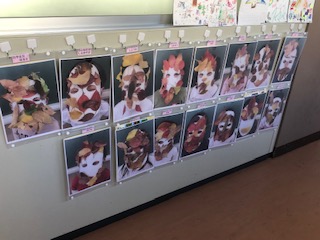 1年生のこのクラスは算数の「比べる数」に取り組んでいます。廊下には色々な掲示物があり、「秋見つけ」で拾ってきた秋グッズを綺麗にして顔の周りに縁取りして写真を撮ったものや窓ガラスをカラフルにして外の青空に映える飾りなどがあります。