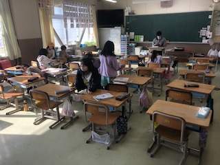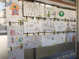 1年生のこのクラスは、休憩時間になり、たくさんの子どもたちが外へ行った後の教室です。廊下には絵の作品掲示があります。クリスマスをテーマに描いているようです。