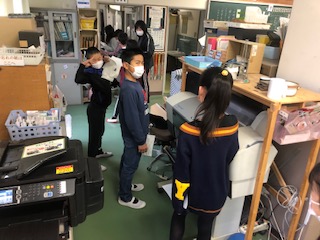 朝1番は6年生の平和学習報告会です。最初に話す人たちが8時半になる前に放送室に集まって来ました。各教室ではパワーポイントでテレビ画面にその場面を写し出します。