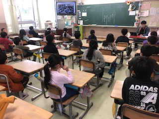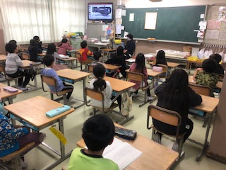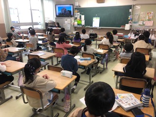 2年生の教室へ上がるとパワーポイントで映像が写り、6年生の語りが浸みわたるように流れています。原爆ドーム、「いわたくんちのおばあちゃん」の岩田さんのお話を聞く場面、広島に落とされたリトルボーイという原爆がTV画面に見えます。6年生は語りもしみじみとしていましたが、内容が素晴らしく、聞いているだけで心がズーンと打たれる思いでした。