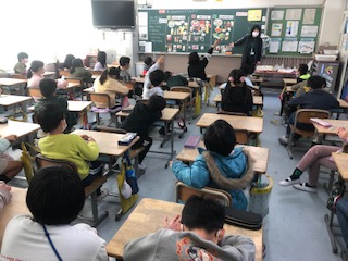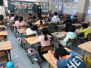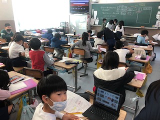 3年生の2クラスです。1クラスは食育の授業です。栄養素を色で分けたり、給食のメニューと結び付けたりして、理解していきます。1クラスは、英語の授業でグリーティングカード(年賀状)を書いているようです。タブレットでデザインを調べています。