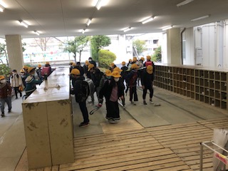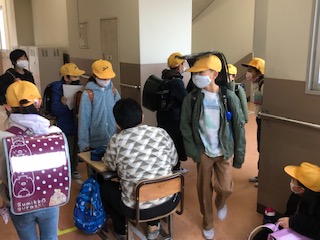 朝の校内風景、3年です。下足室には2年や4年もいます。朝の健康チェック、それぞれがすっかり手際良くなりました♪