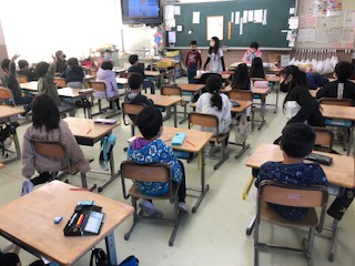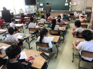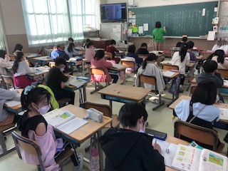 2年生の教室です。1クラスは国語の「おはなしをつくろう」で自分で創作しています。1クラスは「百マス計算」にかけ算で取り組んでいます。九の段まで全部書けたかな〜♪ 1クラスは授業が終わってあいさつをするところです。日直さんがしっかり仕切っています♪