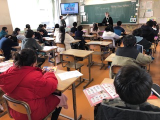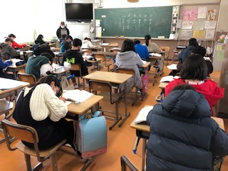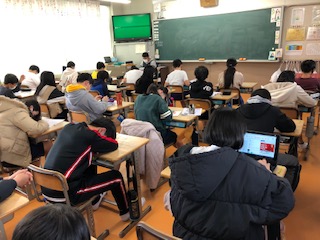 6年生の教室、1クラスは英語で「私の1番な思い出は…。」を表現することを学んでいます。1クラスは朗読して紹介する詩を選んでいます。1クラスはプリント学習の時間です。