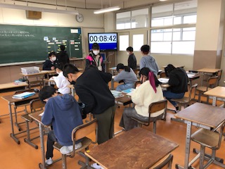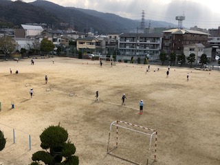 5年生です。算数の少人数分割授業のもう半分は、少人数教室で学習しています。問題を全部解いた人は他の人の進み具合や理解の状況を寄り添って見とっています。止まっている場合は、声をかけて学び合いが始まります。校舎の上から運動場で1クラスがハードルなど体育の授業を行なっている様子が見えました。