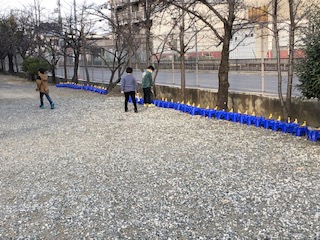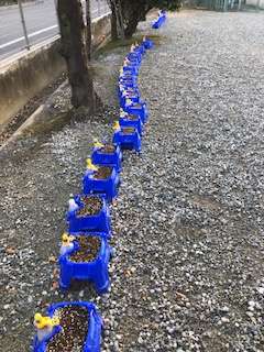 植木鉢が並んでいますが、お花はありません。出て来たのは1年生、水やりが朝のお仕事です。寒い中も水を汲んできて丁寧に水やりしています♪芽が出るのが楽しみです♪春がきたらきれいな花を咲かせることでしょう。