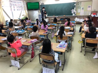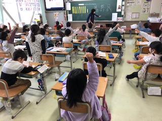 1年生の教室です。1クラスは算数、いつの間にか100までの数字の学習です。100を作るには…黒板に9と5と書いてある所の間違いに気がついた人たちから手が上がります。1クラスは今日は何の漢字を学習しますか?子どもが「生肉の生」です、と答えました。微笑ましい♪ すると「生活の生」と音読みで答えた子もいました。素晴らしい!1クラスは、姿勢などのチェックでみんなの背筋がグッと伸びました。そして手拍子しながら先生が言うものが食べ物だったら「いただきます」、食べ物でなければ「いただきません」というゲームをしていました。「お好み焼き」「親子丼」…「隕石」でみんな「ええーっ」、楽しくクラスが団結です♪