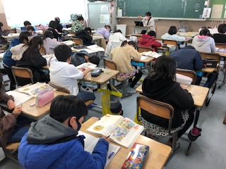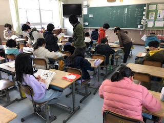3年生の2クラスです。1クラスは国語「音訓カルタ」です。例えば「遠足だ 遠くに行けて うれしいな」と、カルタの中で同じ漢字「遠」を音読みと訓読みで使う言葉遊びです。1クラスは教科書の季節それぞれの人の様子を見て、いつ何をどうやってその季節を楽しんでいるかを表現する学習です。四季の移り変わりがはっきりしている日本の文化に繋がった学習です♪ 教室の中には床のゴミが落ちたままの様子が掲示され「どうしたら良いでしょう?」と訴えが・・・俄然みんなが意識するようになったようです。気がつくのは大きな成長だと思います。