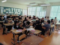 6年生の教室を覗いてみると、国語と音楽の学習をしていました。国語ではグループで音読をしていました。音楽は、授業の残り時間が少しになったところで、リズムに乗って言葉を次々に言っていくゲームをしていました。