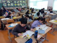 4年生は総合学習で防災について調べています。今日は、大東市の危機管理室の方に来ていただいて、防災について学習しました。まず初めに学校にある備蓄倉庫に行き、備蓄されている食料品などを教えてもらいました。ご飯は、1人ずつ食べれるパウチに入ったアルファ米で、五目御飯など味のついた混ぜご飯が6種類ありました。ご飯ばかりでは飽きるのでパンもありました。赤ちゃん用の粉ミルクや哺乳瓶、簡易トイレもありました。外で個人用のスペースを確保するパーテーションやベッドを見せてもらいました。子どもたちの「寝心地はいいの?」という質問から希望者がベッドに寝転ぶ体験をしました。