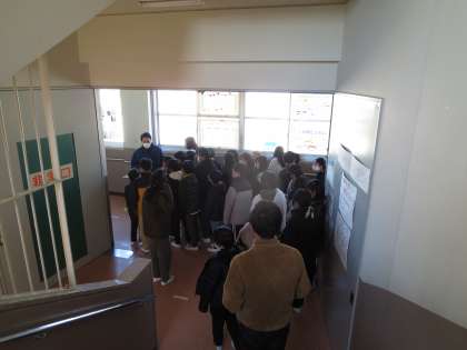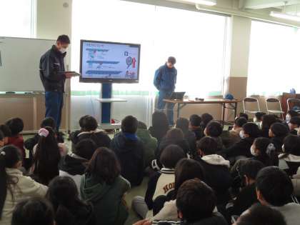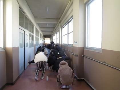 5年生が消防署の方をお招きして、もし火事になったときにどうするかということを学びました。また、実際に学校を歩いて、非常口の掲示や防火扉などを確認しました。煙は上に上がるという性質から煙の中を逃げる場合には、体をかがめて逃げるということも教わり、実際に体験してみました。火事は起きないことが一番ですが、「もしも」のときを考えて、自分の身の守り方を教えてもらいました。