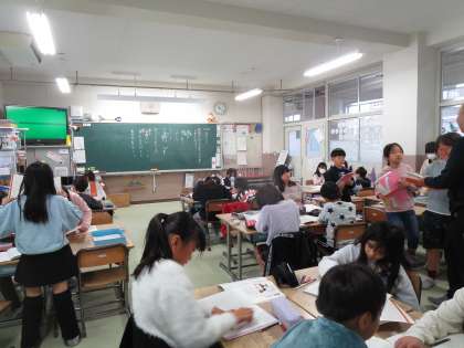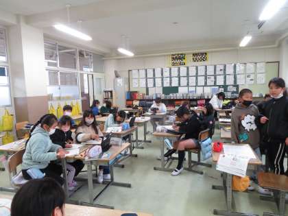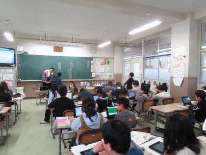 3年生の教室を覗いてみると、国語や社会の学習をしていました。国語では、冬のくらしについて、タブレットPCで入力していました。入力したら先生に送信し、後でみんなで共有するようです。PCを使うとみんなの考えが簡単に共有できて便利です。社会では「昔のくらし」を調べていました。「今はなんでも自動でできて便利でいいけど、昔の手動で出来た時の方が、おもしろそうだなあ。」という子どものつぶやきがありました。それぞれの時代のよさが見つけられるといいですね。