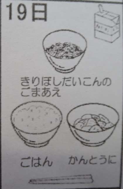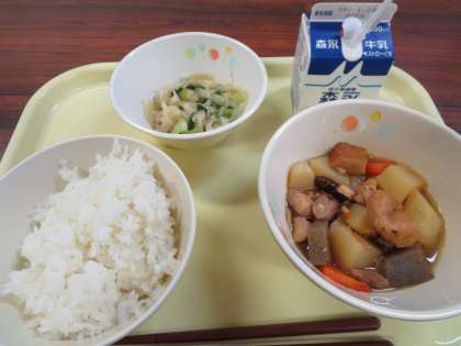 今日の給食は、ごはん、関東煮、切り干し大根のごまあえ、牛乳です。