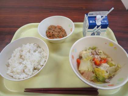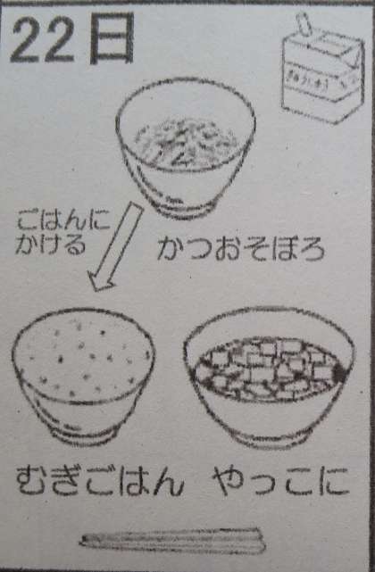 今日の給食は、麦ごはん、やっこ煮、かつおそぼろ、牛乳です。