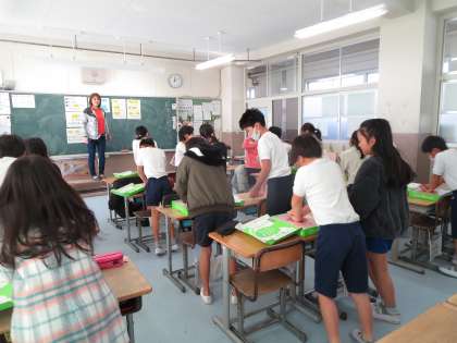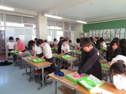 4年生の保健指導として、救急救命法の実習をしました。もし家でお家の方が倒れた場合に子どもの自分達でもできることを学習しました。まず電話をすること、大人の方を呼ぶこと、そして大人の人が来るまでにできることとして、「胸骨圧迫」の実習をしました。「あっぱくん」という実習キットを使って、二人組で交代しながら胸骨圧迫をしました。また、AEDについての紹介をしました。
