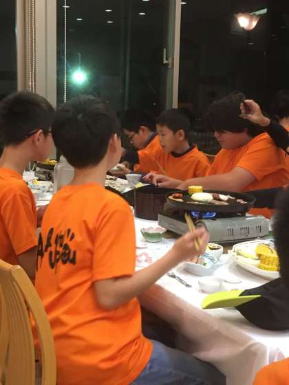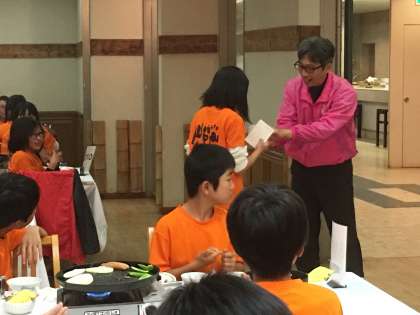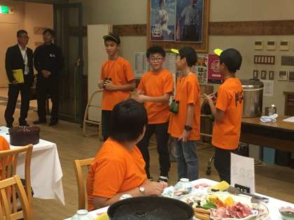 宿舎に着き挨拶の後、夕食をいただきました。夕食のメニューは焼き肉。刺身もありました。自分たちで焼きながらお腹いっぱい食べていました。夕食後の恒例の抽選会は大変盛り上がり、当たった子はもちろんのこと、当たらなかった子も楽しみました。