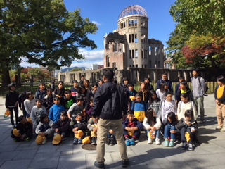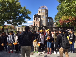 青空の下、無残な姿の原爆ドーム、たくさんの人が訪れていました。