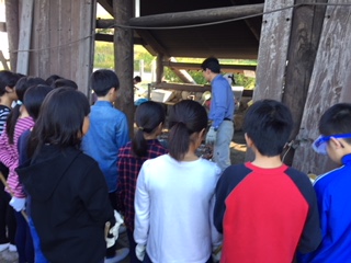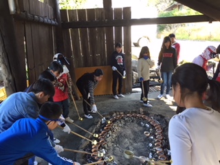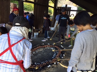 今日の体験学習、藻塩作りです。説明を聞いて、乾燥しないように、ひしゃくで藻とからんだ濃度の濃い塩水を、小さな小鉢をよく見ながら加えます。