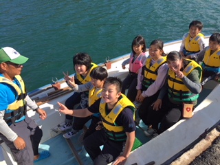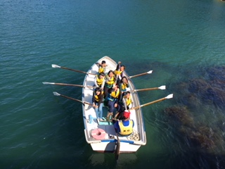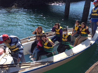 カッター体験、こわごわ乗り移りました。そして「オーエス」のかけ声に合わせて…すぐに上手な漕ぎ手となりました♪