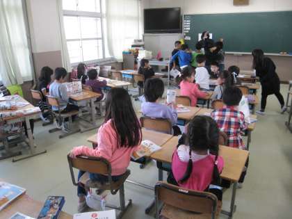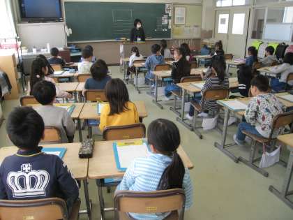午後の教室の様子です。2年生、教科書の記名や乱丁がないかを点検していたり、校舎周りの自然観察へ今から行くところに出会いました。よく先生のお話を聴いています。