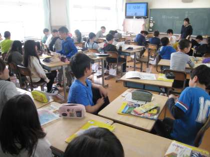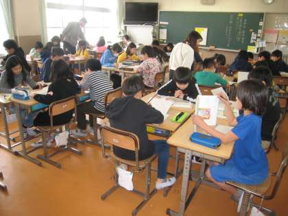 5年生の教室です。国語の授業では、新見南吉の物語「あめ玉」を読んで中心人物を見つける学習活動を行っていました。社会の授業をしているクラスでは、地図の大きさを学んでいました。