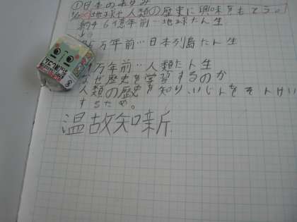 この教室では社会の大昔の学習で、ちょうど「温故知新」という言葉も学んでいるところでした。「温故・・」まで書いたところで、「知ってる」と発表してくれた子がいました。すごい、博学です!