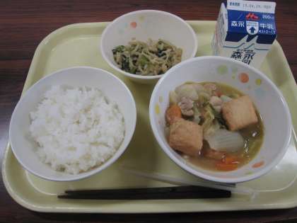今日のメニューは和風でした。主菜は大好きな厚揚げと鶏肉の味がからまって美味しい一品です。切り干し大根と葉野菜を炊いた副菜は、ちょっと大人びた味でした。
