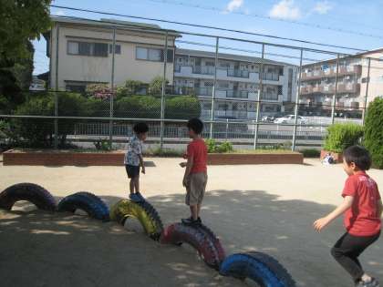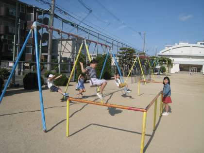 子どもたちが運動場で生き生きと走る姿は、平和な四条小学校の象徴的な場面だと毎朝幸せを感じます。入学してすぐは、教室でいろいろな準備をしていて、外に出て来なかった1年生が、タイヤにもブランコにもいます。