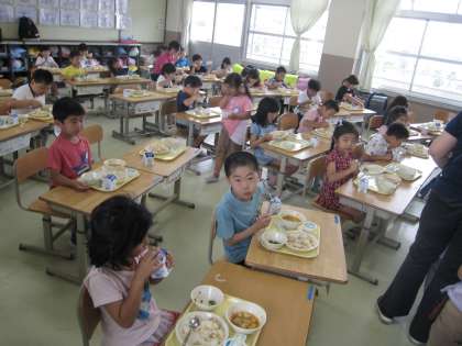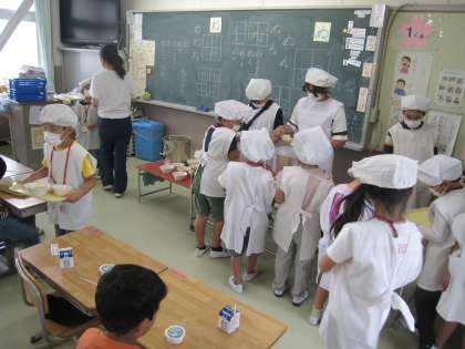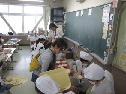 おいしい給食、準備に6年生がお手伝いに来ています。もう、いただきます、をしたクラスもあります。おいしい顔〜