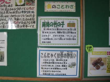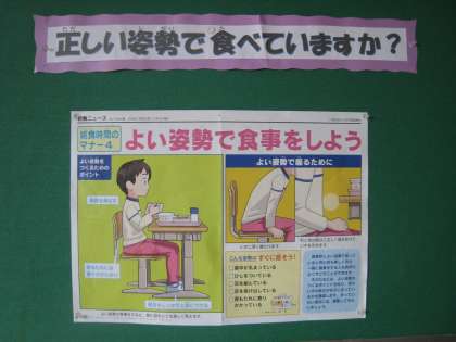 食育掲示板です。食事の時の姿勢、・・自分ではきがつけません。お家でも姿勢よく食べる習慣をお願いします。季節の食材を給食にも意識的に取り入れています。ことわざも「ふ〜ん」ですね、知識が広がります。