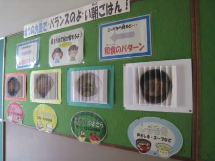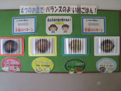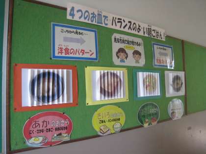 食育掲示板に「バランスのよい朝ごはん」として、赤、黄、緑、白のお皿で、大切な栄養と献立・・・左から見ると洋食が現れ、右から見ると和食が現れて面白いです。
