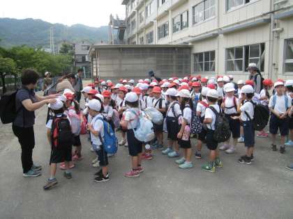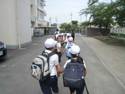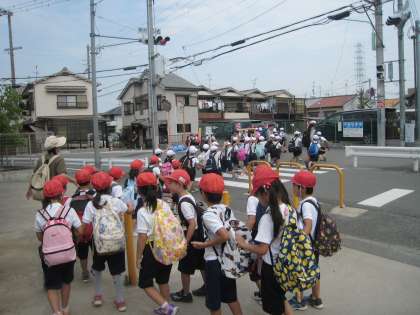 前回雨で流れた1年生の遠足、今日は元気に出発しました。めざすは寝屋川公園、きちんと並び、2列で手をつなぐのも上手、手を挙げて横断歩道を渡ります。いってらっしゃい〜♪
