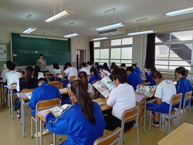 1組 美術 日本の美術の歴史について資料集や教科書の作品を見ながら確認をしていました。日本最古のマンガといわれる鳥獣人物戯画について自分で選んだ一部を切り取って模写していきます。