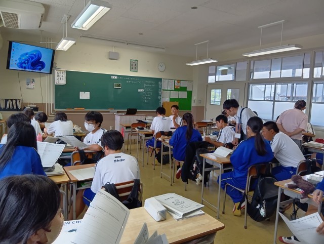3組 英語 比較についての英文を理解していく過程でプリントの英文を近くの人と読み合ったり、意味や読みかたを確認していました。