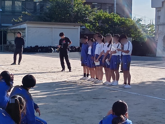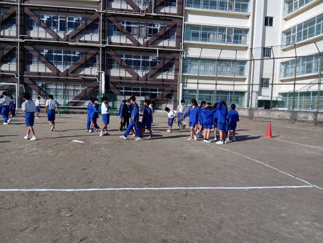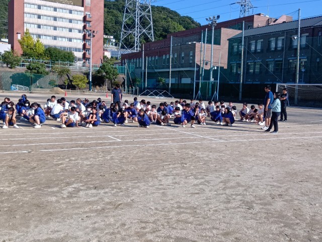 続いて開閉会式の流れや入退場について動きの確認をしました。涼しくなってきたとはいえ、陽の当るところはまぶしく暑い中、顔を上げて話が聞けていました。