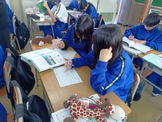2組 英語 英文の和訳にチャレンジしています。「単語がわからなかったらすぐ調べる」が基本とされていました。