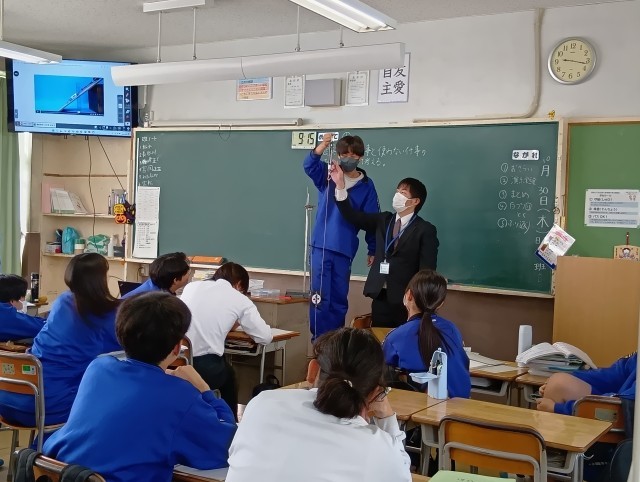 3年生 理科 ものを持ち上げるときに、そのままで持ち上げる場合と動滑車を使って持ち上げた場合について教室の中で演示し、運動、エネルギーについて学習しています。