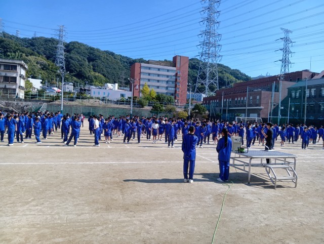 明日のプログラムに天候による変更の可能性があること、生徒席では防寒着の着用が可能であることなどの連絡が伝えられています。