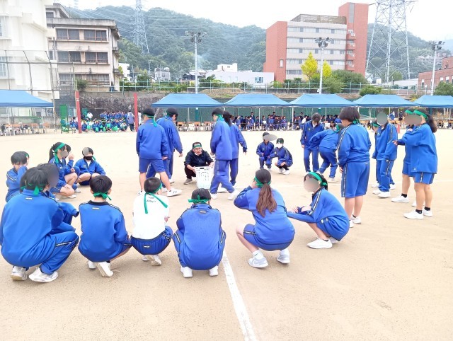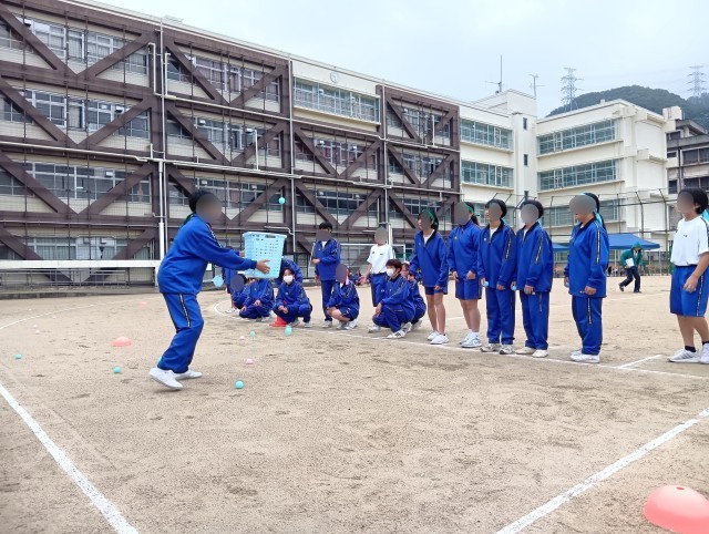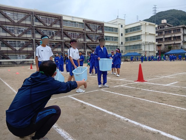 かごを持った各クラスの代表がトラックを1周走る間に、各地点にいるクラスのメンバーから球を受け止めゴールするという速さと集めた球数で競う競技でした。
